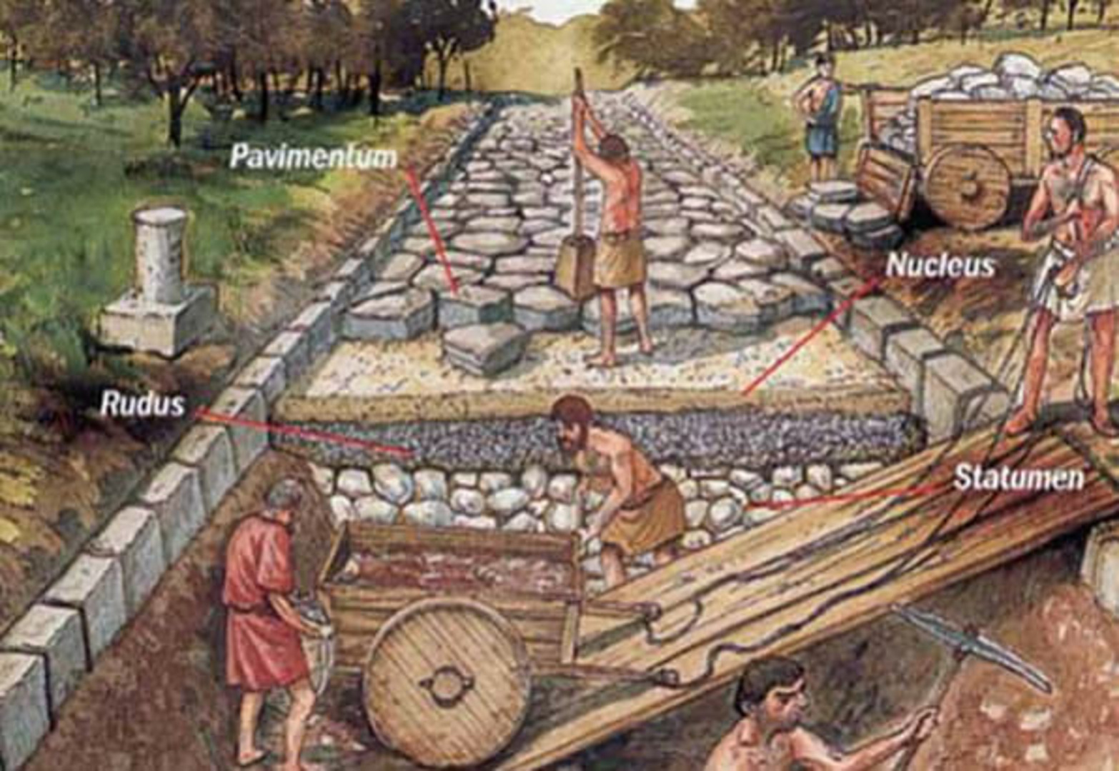 Rappresentazione storica della stratigrafia delle antiche strade romane, richiamata come riferimento teorico per la composizione degli strati della moderna sovrastruttura stradale.