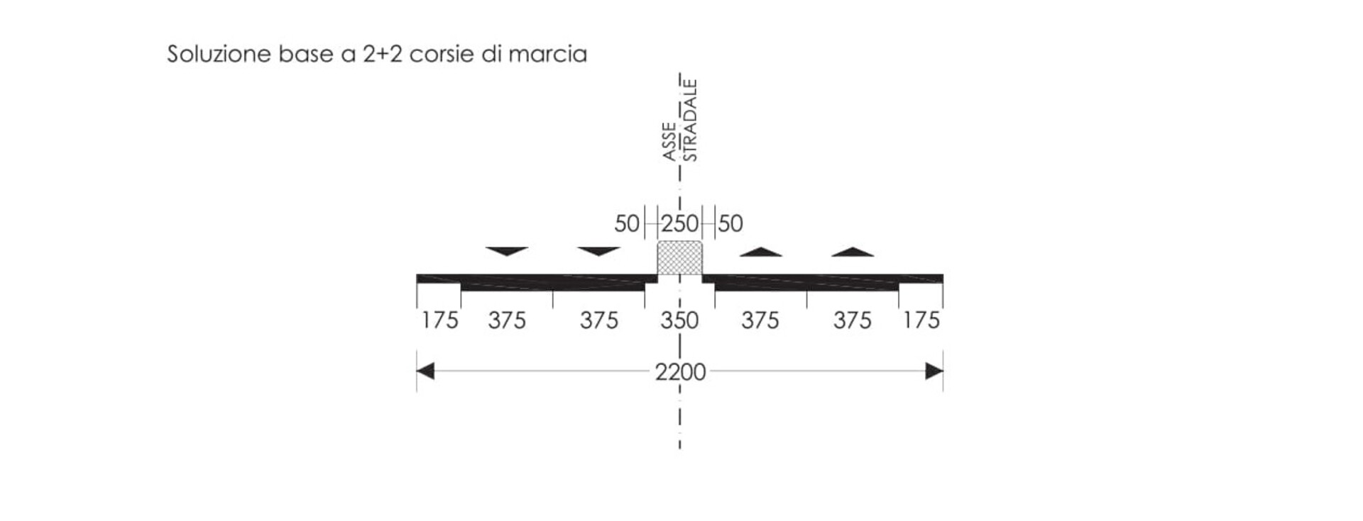 Sezione tipo di piattaforma stradale a 2+2 corsie di marcia con spartitraffico centrale, utilizzata come riferimento geometrico per la progettazione della rotatoria e dei rami di innesto.