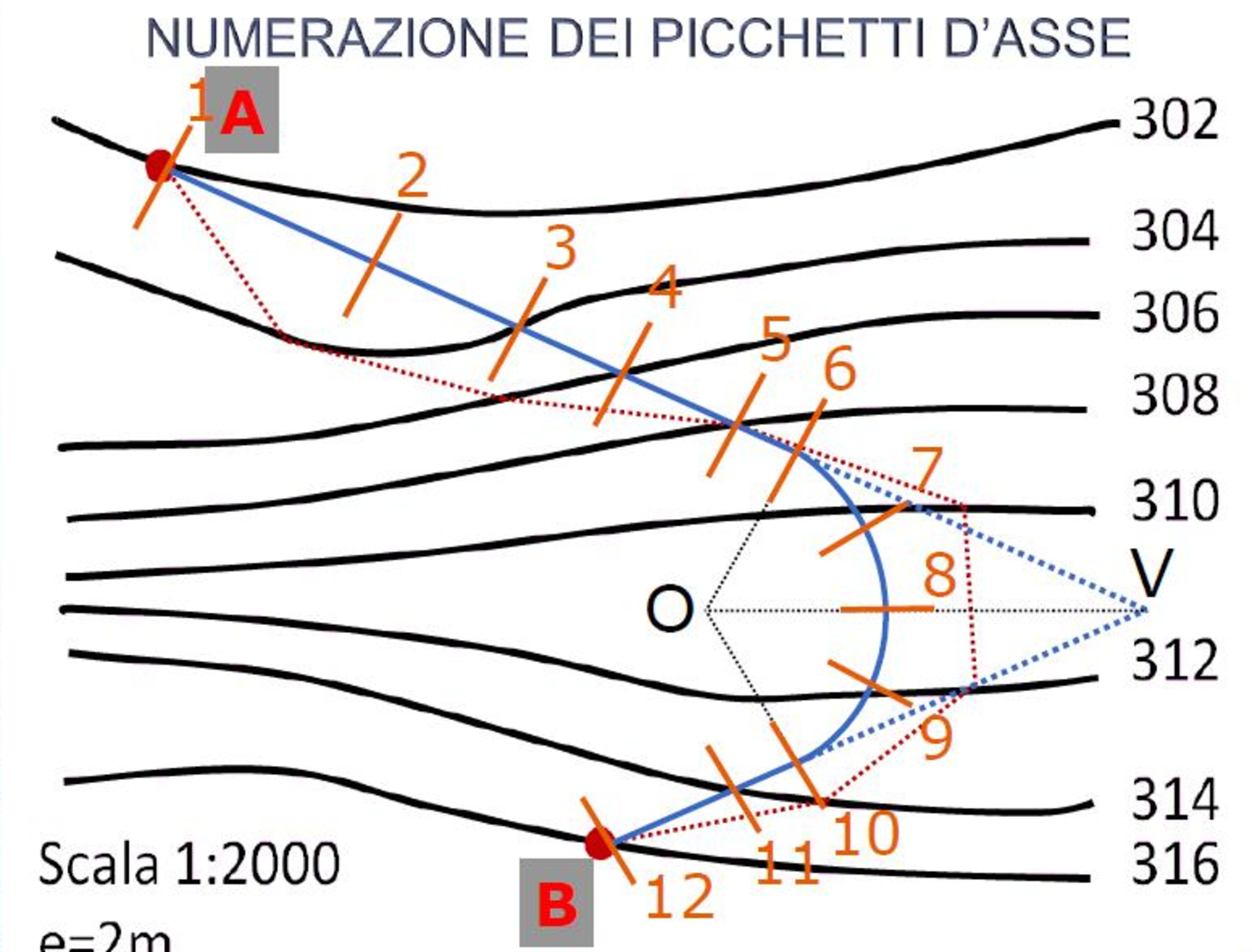 Schema plano-altimetrico con numerazione dei picchetti d’asse e tracciamento della curva di raccordo, impiegato per la definizione della geometria in pianta e in quota.