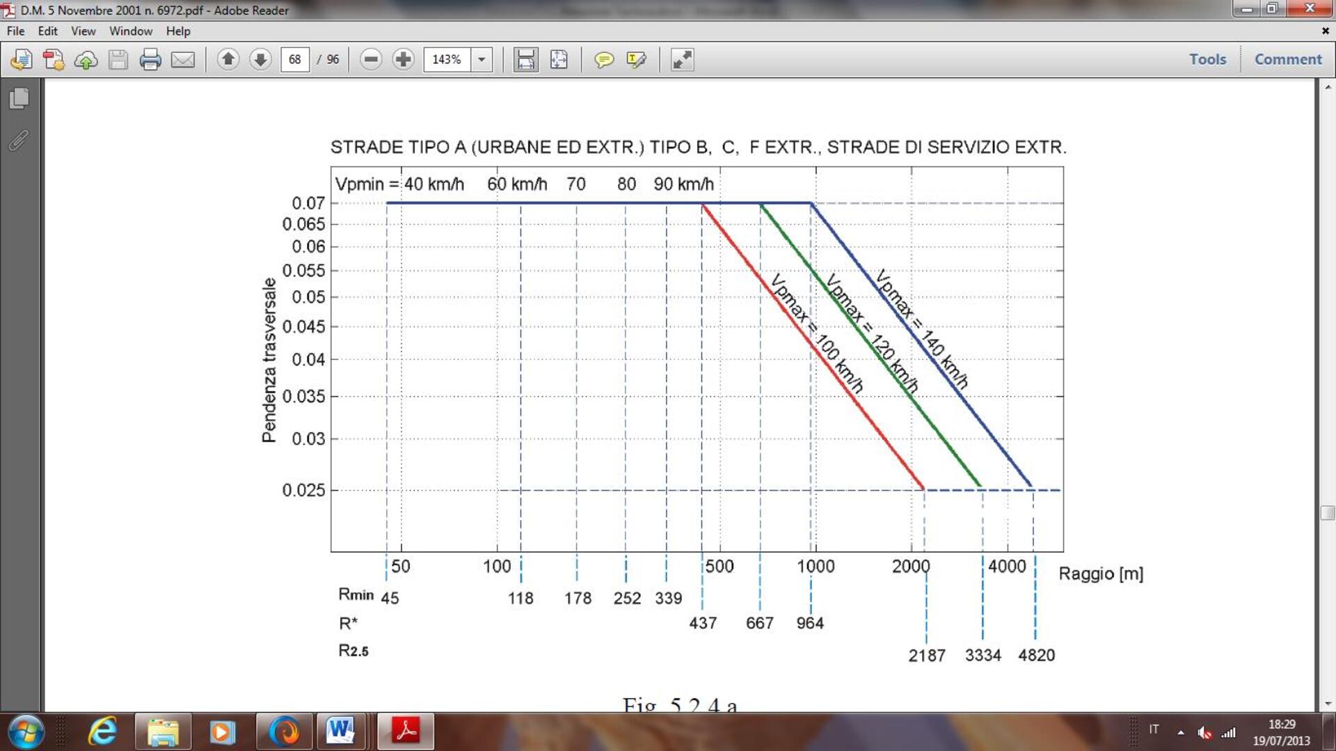 Diagramma normativo tratto dal D.M. 05/11/2001 per strade di tipo A, B, C, utilizzato per la verifica dei raggi di curvatura e delle pendenze trasversali in funzione della velocità di progetto.