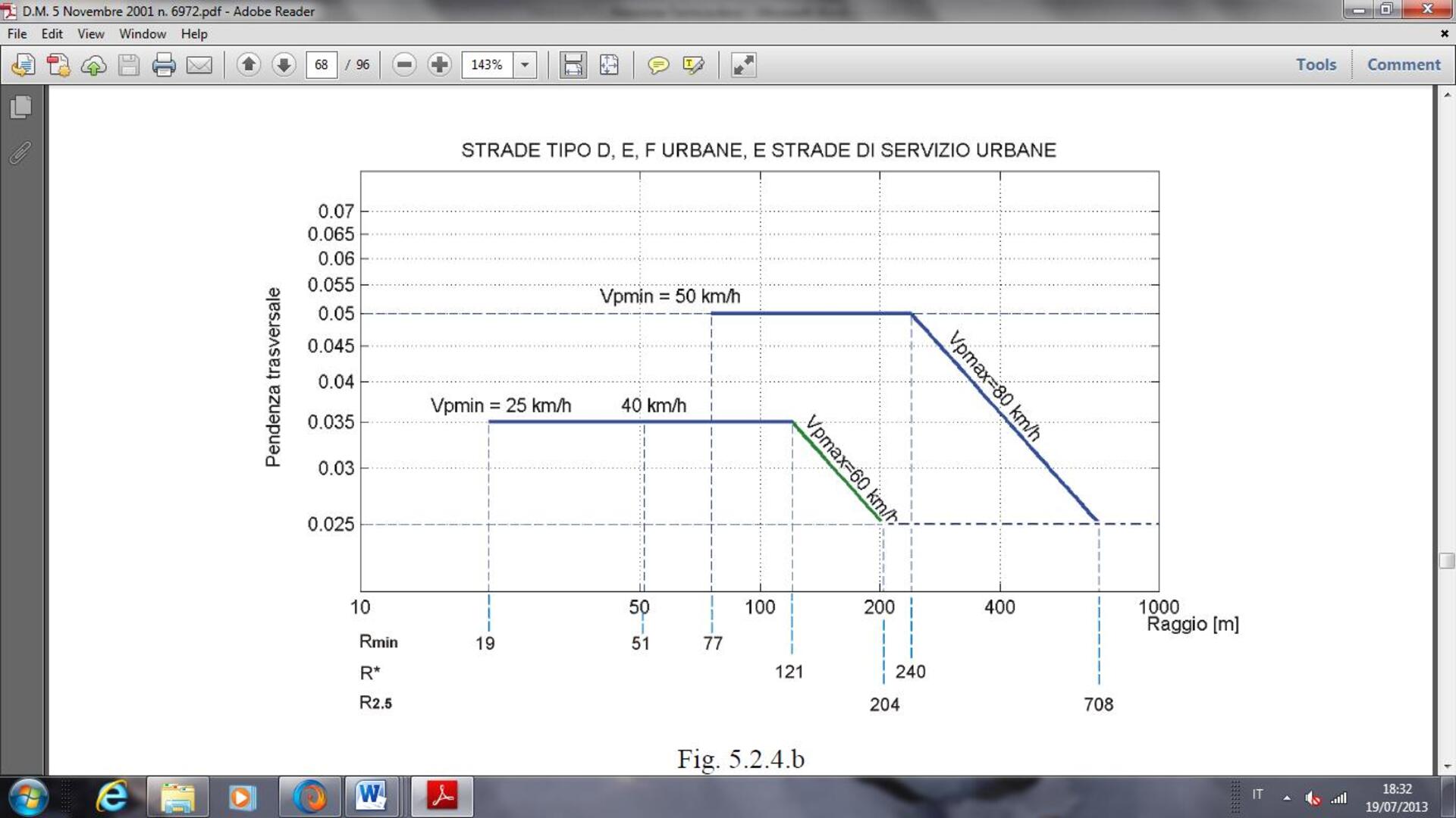 Diagramma del D.M. 05/11/2001 relativo alle strade di tipo D, E, F e di servizio urbane, impiegato per il controllo della compatibilità tra velocità, raggio di curvatura e sopraelevazione.